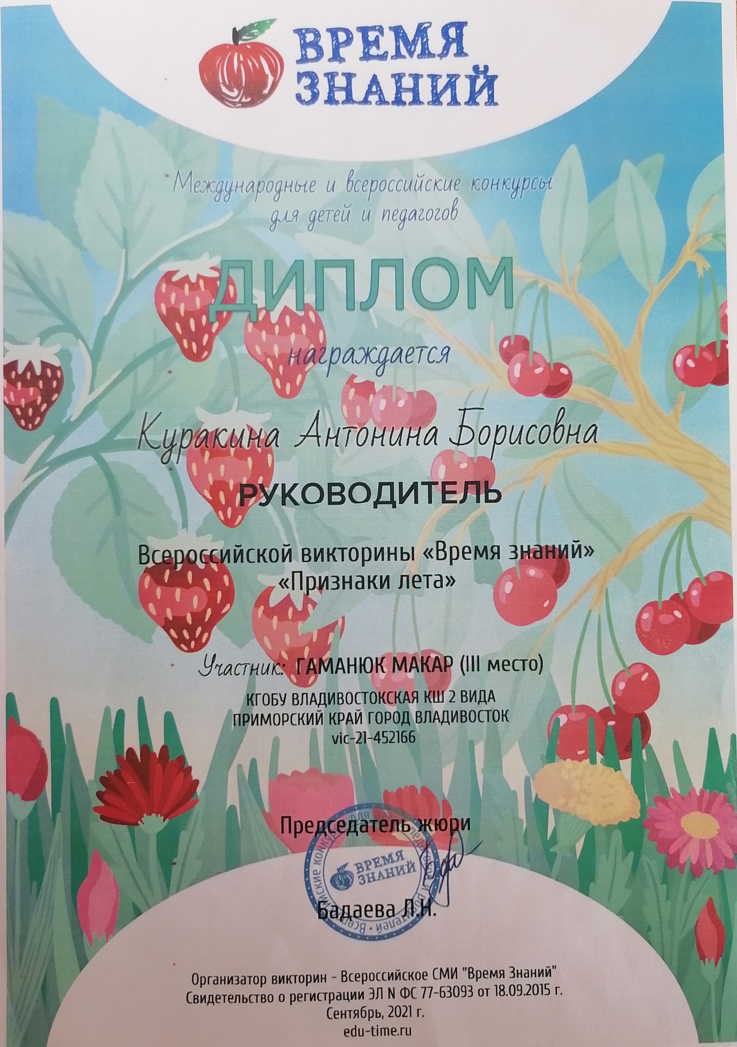 Всероссийская викторина "Признаки лета " Всероссийское СМИ "Время знаний"